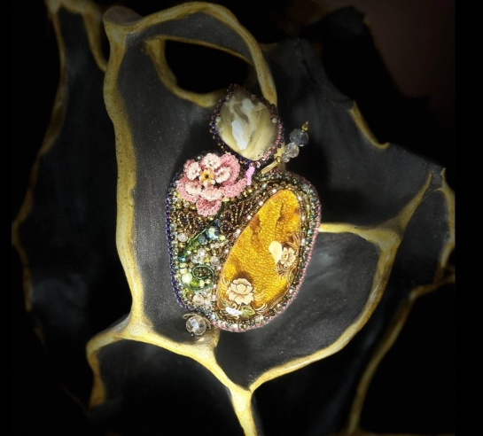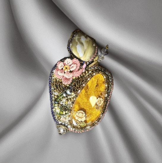 Крупная брошь из натурального янтаря с миниатюрной росписью в виде распустившихся цветов и ручной вышивкой.