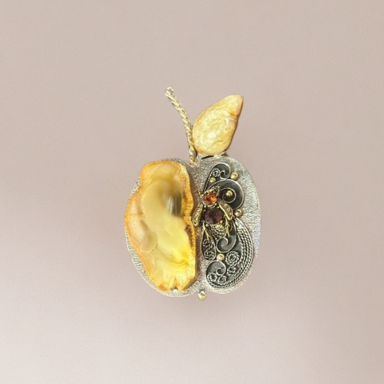 Изделие из янтаря и металла выглядит изысканно и современно. Янтарь сияет мягкими переливами, металл делает его строгим и элегантным. Это украшение ручной работы станет универсальным аксессуаром.