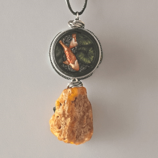 Украшение ручной работы в виде кулона сочетает в себе два элемента природы — янтарь и дерево. Янтарь хранит солнечное тепло, дерево придаёт аксессуару естественный баланс. Кулон будет уместен и в повседневном стиле, и в праздничном.