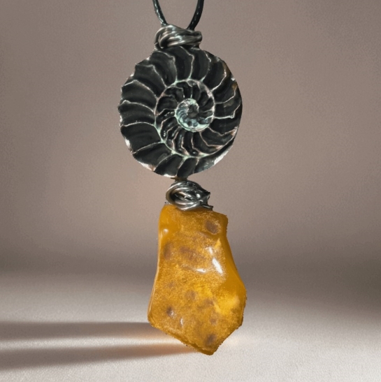 Украшение ручной работы в форме кулона сочетает в себе янтарь и дерево. Янтарь светится тёплым светом, словно маленькое солнце, а дерево придаёт аксессуару природную фактуру. Этот кулон подойдёт для любого образа — от повседневного до вечернего.