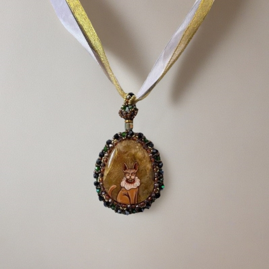Кулон «Аристократка» — кулон с миниатюрной авторской росписью в виде сфинкса. Строгость этой породы мы смягчили красивым белым жабо. В результате получился образ более аристократичный, нежели Египетская кошка. Обрамление из крупных гранёных бусин черно-графитового цвета в сочетании с атласной лентой подчеркнёт вашу индивидуальность.