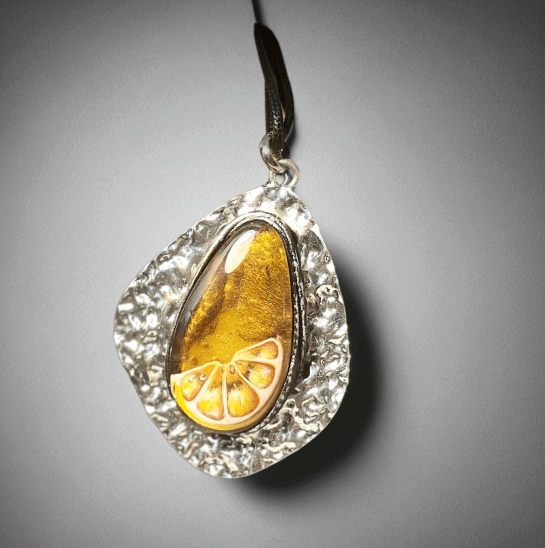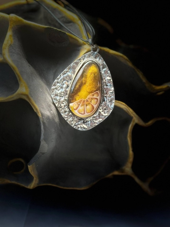Несмотря на простой сюжет (долька лимона), работа сложная. Корочка оставлена с задней стороны камня, поэтому на свету она переливается, дополняя роспись, а роспись с сочной мякотью лимона подчеркивает красоту камня.