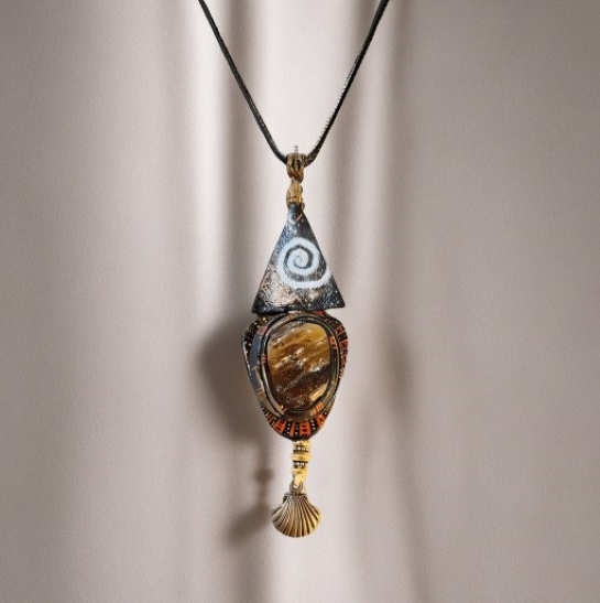 Это изысканный украшение — длинный кулон на черной шнурке, выполненный из сочетания натуральной кожи и живописи. Основной элемент — овальный янтарный камень с теплым золотистым оттенком, окруженный кожаными вставками с узорами. Над камнем расположено декоративное кольцо с серебристым спиральным узором, создающим эффект движения. В нижней части кулона закреплена небольшая ракушка, добавляющая морской эстетики. Идеально подходит для тех, кто ценит уникальный стиль и природные материалы.