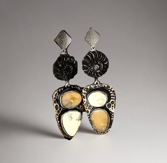 Серьги «Аммониты» — сочетание черного граба кожи и красивейшего пейзажного королевского янтаря, выполненного в авторских техниках. Всё это подчеркивает эксклюзивность каждой нашей работы, в том числе и этой пары сережек. Они крупные, как сейчас принято, но очень легкие. Всё продумано нашим дизайнером до мелочей. Их можно носить отдельно от всего остального. Они самодостаточны, но для тех, кто любит более насыщенные образы, можно добавить кулон из этой серии.