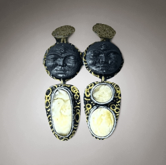 Это уникальные ручные украшения, выполненные из натуральных янтарных камней и кожи. Основные элементы — два черных каменных кулона с выразительными лицами, символизирующие мудрость и гармонию. Они дополнены овальными вставками с янтарным оттенком, обрамленными кожаными рамками с узорами. Изделие красиво сочетается с разными стилями одежды и отлично подчеркнет индивидуальность владельца. Идеально подходит для тех, кто ценит оригинальность и натуральные материалы в украшениях.