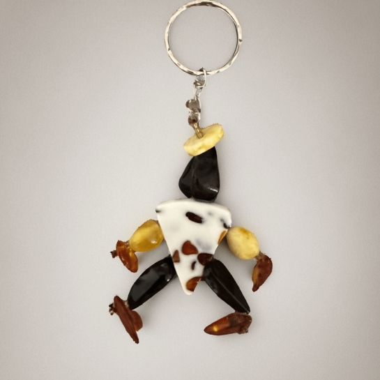 Это оригинальное украшение, выполненное из натурального янтаря и других природных материалов. Фигурка человека создана из кусочков янтаря разных оттенков — от светлого до темного, что придает изделию яркую и насыщенную гамму. Такой аксессуар отлично подчеркнет вашу индивидуальность и станет оригинальным элементом вашего стиля, символом теплоты и природной красоты.